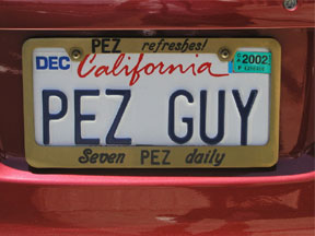 Here is a picture of my dad's license plate wich says Pez Guy on it. On the bottom it says Seven Pez daily. My dad goes to the Pez museum every day. |